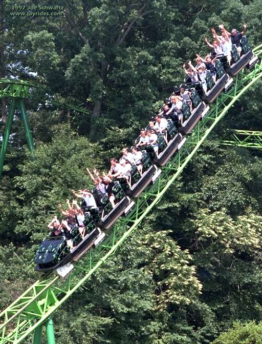 | Arragement | 3 trains with 5 cars per train. Riders are arranged 2 across in 2 rows for a total of 20 riders per train. |